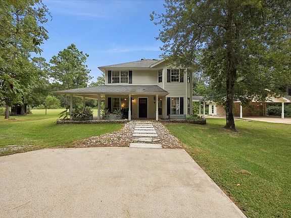 Tucked beneath 1.3 acres mature trees, this modern-farm charmer blends style, space, and indoor-outdoor living. A welcoming wraparound porch and stone path lead to a warm, light-filled interior where a floor-to-ceiling brick fireplace anchors the living room. Picture windows invite natural sunlight throughout, and multiple sitting areas make everyday living easy. The bright kitchen features cabinetry, quartz countertops, and a breakfast bar—perfect for quick meals or keeping the chef company. French doors open to a relaxing pool and patio with sweeping views of the green grounds—ideal for gatherings and summer celebrations. A private secondary living space includes its own kitchen, bath, and living area-great for multigenerational living, guests, or potential rental. An extended driveway and multiple covered parking areas provide plenty of room for visitors, boats, or toys. Enjoy the best of country tranquility with modern comforts—space to spread. This property includes all the bells!