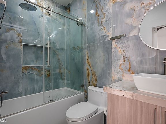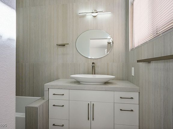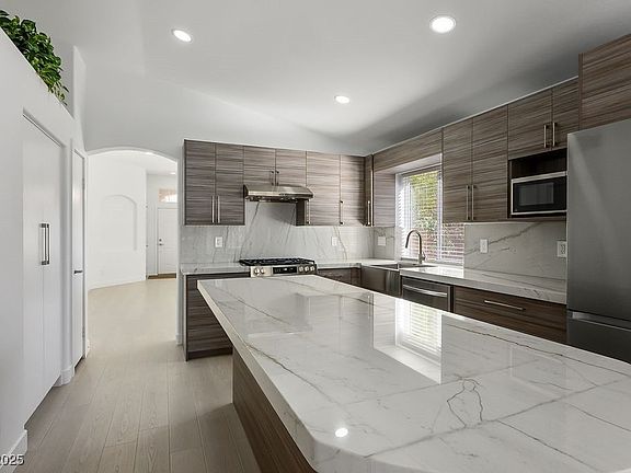 Beautifully renovated rare single story with dual master suites on an extra large pool-sized lot. Fully remodeled stunning modern kitchen with quartzite countertops and 2 bathrooms with designer finishes. Shaw LVP flooring throughout. Custom walk-in closet in the first bedroom. Second bedroom features an office/study and custom storage cabinets. Recently upgraded HVAC system, water heater, appliances, lighting, ceiling fans, custom window treatments, irrigation system, and interior paint. Oversized backyard features covered patio, new landscaping, Zen garden and various sitting areas. Located in desirable Sycamore Heights, minutes from Downtown Summerlin, shopping, dining and entertainment. Walking distance to highly sought after middle and high schools, Arbors Tennis and Play Park, and Veterans Leisure Center.
