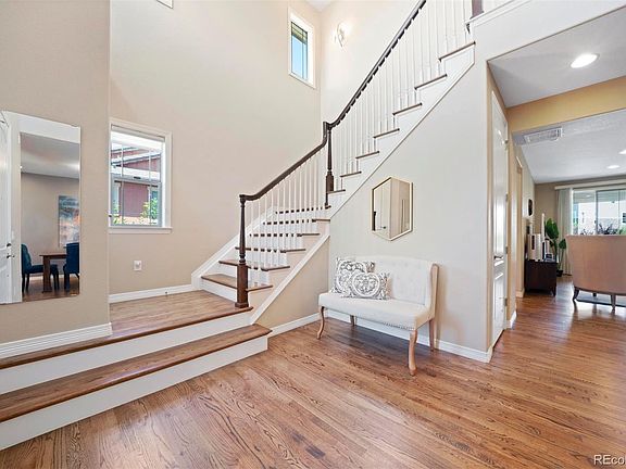 NEW KITCHEN AND UPDATED CABINETRY THROUGHOUT THE HOUSE! This stunning and immaculate home built by Shea is the perfect floor plan. As you enter the home you are greeted by a grand foyer with cathedral ceilings. Feel the openness as soon as you step inside. Close by is the generously sized dining room that is excellent for entertaining. Bright, and open concept in this home is the perfect place for many to gather and has incredible wood floors throughout the WHOLE house. You will love the size of the Great Room that opens up into the Gourmet Kitchen and oversized nook. A Chef inspired kitchen with white quartz countertops and backsplash, gold plumbing, large island, double ovens, gas cooktop, SS appls, and more. Don't miss the oversized pantry! A main floor guest suite/office and a convenient 3/4 bathroom welcome your overnight guests. On the upper level, you will notice designer touches and wonderful mountain views. The Elegant Master bedroom is generous in size and is adjacent to the luxurious spa-like bathroom. Also on the upper level are three sizable secondary bedrooms with walk-in closets. One bedroom with an ensuite bathroom and the other two share a Jack & Jill bathroom. An upstairs laundry room is a desired location with storage, and utility sink. Another feature you may like is the many added can lights throughout. The garden level basement is waiting to be finished. Step outside to find a serene covered deck, hear the water trickle from the piece of art like water feature. Have fun in the semi-private yard with views of the open space and a peak of downtown. The three-car garage is perfect for all the toys and storage. Walk to the Sundial house with resort-style pools, fitness, spa treatment room, and a bar area that offers happy hour with live music & activities for all ages. Community concerts & movie nights at the outdoor amphitheater. Head out the front door to acres of open space & steps to the hiking/biking trails! Playgrounds to enjoy year-round.