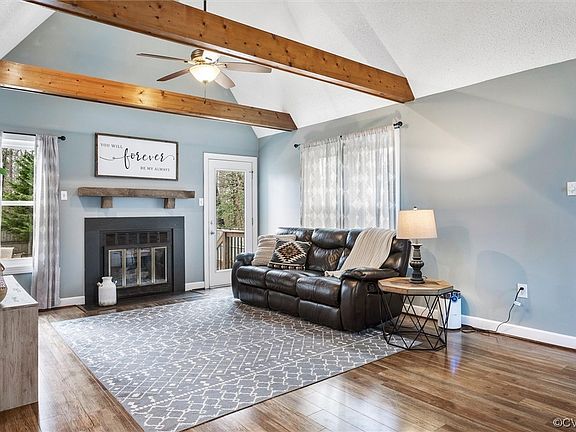 This 3 bedroom, one-level, charmer boasts a NEW ROOF and NEW VINYL SIDING on the outside and a move-in-ready interior with an open concept family room and kitchen! Stunning wood beams highlight the vaulted ceiling in the family room. There is also a propane fireplace and rustic wood mantle. The large, eat-in kitchen has gorgeous granite countertops, large windows, and wood cabinetry. The primary bedroom has a walk-in closet and a bonus second closet, as well as, an attached full bath with an updated vanity and fixtures. Along the main hallway are two additional bedrooms and a beautifully renovated second full bath with a laundry closet. Step outside to the huge backyard with privacy fence and a concrete patio area...bring on the s'mores! New windows were installed in 2014. This home is conveniently located to schools, restaurants and shopping! Easy to show! Make your appointments today!