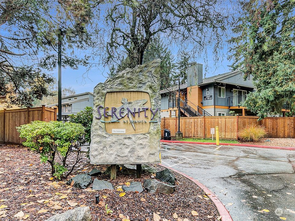 2-bedroom condo in the gated community of Serenity. Quiet end unit features large master bedroom with dual closets & easy access to full bath. Updated kitchen & bath with newer quartz counters, paint & flooring. Private covered deck has locking storge & yard access. Kitchen with open bar to oversized dining room. Crown moulding throughout. Cozy wood-burning fireplace. All appliances included, full hookups and full-size washer/dryer. Zero entry stairs. Well-maintained community with recent updates including siding, roof, decks, and windows - showing pride of ownership. The complex includes pool, cabana, playground, sports court & huge playfield. Pet-friendly complex. Close to 405, Juanita Village & Totem Lake Shopping