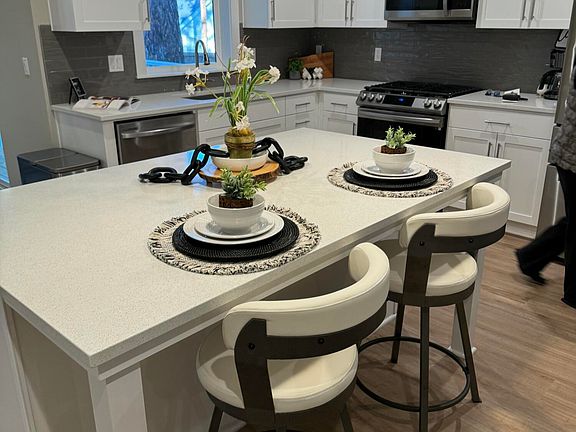 - Breakfast Bar, Double Vanity, Enclosed Toilet(s), Kitchen Island, Linen Closet, Open Floorplan, Shower/Tub Combo, Solid Surface Counters, Tile Shower, Walk-In Closet(s)