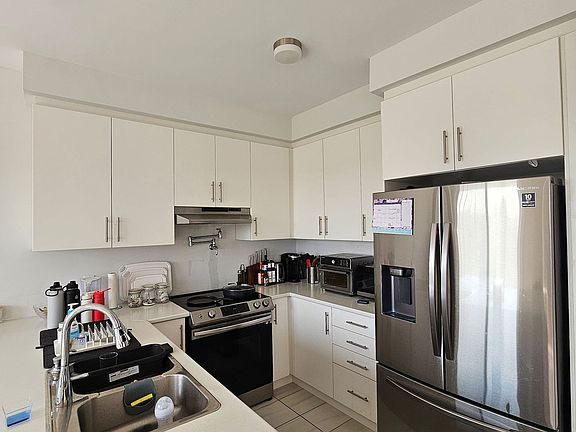 Chef delight kitchenStainless steel appliancesWhite cabinetsOak stairsIron picketsThree spacious bedroomsMaster with walk-in closet