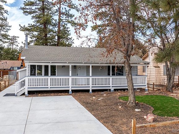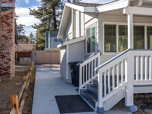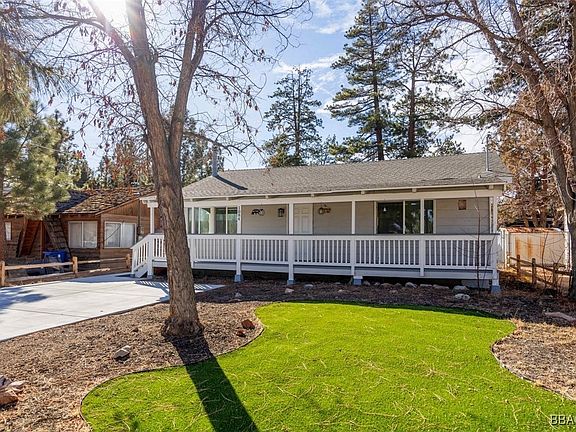 Beautifully remodeled, turnkey home with great views of Gold Mountain and Baldwin Lake. Recent upgrades include new luxury vinyl flooring throughout, newer kitchen cabinetry with quartz counter tops, stainless steel appliances and farmhouse sink, recessed lighting, Milgard energy efficient windows, remote-controlled ceiling fans in bedrooms, custom tile in bathroom, newer paint in and out, upgraded electrical panel, newer water heater, and high-quality stackable washer and dryer. Open great room with light and bright interior has spacious living room/dining areas, and provides a pellet stove for extra heat on those cold, winter days. Pull-down ladder in the hallway allows for easy access to extra storage space in the attic. Enjoy the incredible morning sunrises and mountain views from the full length, covered front deck. Nicely landscaped, drought friendly front yard has synthetic grass area and split rail fencing. Double wide concrete driveway with extended concrete walkway into fenced back yard, offering a perfect place to BBQ or park toys. Low maintenance back yard gets plenty of sun - great for gardening or soaking in the rays - and includes a large storage shed. This well-maintained, upgraded home is located on a level lot with easy access to all highways entering Big Bear, plus prompt snow-plowing services on Paradise Way. Excellent property for a full time residency or vacation home. Must see to appreciate this great value!!