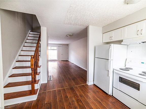 Affordable Solid brick with ceramic, laminate and newer kitchen upgraded home. Freshly painted December 2020. 2 spacious bedrooms on upper, den/bed or family room with 2 piece bath in lower. Open concept on main with access to private backyard and grassed common area. Playground equipment in fenced grounds. Close to 401, elementary and high schools, shopping, transit at entrance. Low utility costs. Great neighbors, quiet complex. All measurements to be verified. Laundry in lower unfinished area. This won't last long!