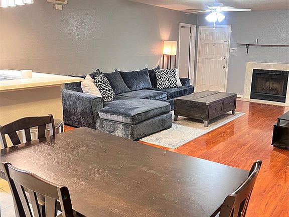 Welcome to 10843 Braes Bend! This move-in ready first-floor corner condo offers 2 bedrooms and 2 full baths in a desirable split floor plan with updated wood and tile flooring—no carpet. The open living area features a cozy fireplace and ceiling fan and flows into the dining space and a modern, fully equipped kitchen with refrigerator, stove, dishwasher, washer, and dryer included. The primary suite boasts a walk-in closet and private bath, while the secondary bedroom is conveniently located next to the second full bath. Step outside to your private patio for entertaining or relaxing. Enjoy assigned covered parking, gated access, and community amenities including a community pool and nearby playground. With a prime location near shopping, dining, schools, and quick access to Hwy 59 & Beltway 8, this condo is a fantastic opportunity for first-time buyers, downsizers, or investors