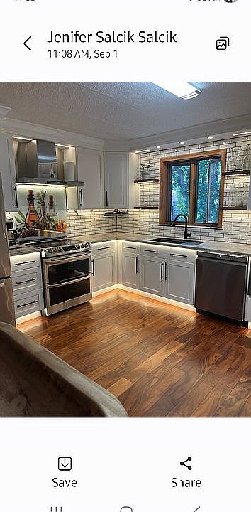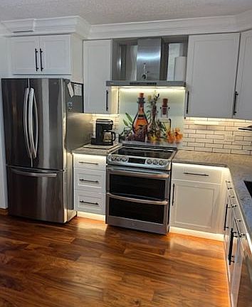Newly renovated kitchen with Corian counters and stainless steel appliances.