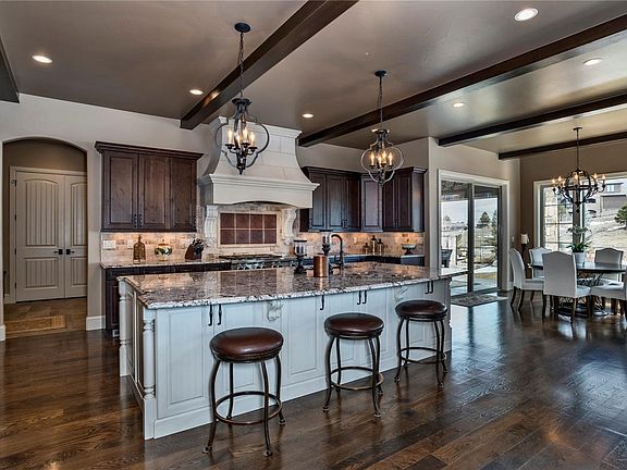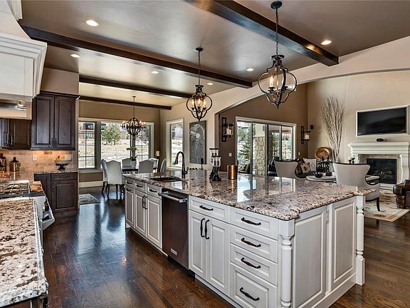Rainribbon Rd. is truly one of Back Country's premier locations with custom homes that all back to open spaces, close to the Sundial House, a cul-de-sac block creates a real oasis within Rocky Mountain oasis. This custom Tuscan style estate home built by Terracina Custom Homes offers: 4 ensuite bedrooms, main floor study, two story great room off a chefs dream kitchen, multiple amazing outdoor living spaces. The upgrades are too many to list but include: Knotty alder beams and 9' entry door, 3 piece crown molding in master, great room and dining area, 7" baseboards throughout. Custom: drapery panels, faux paint, stone fireplace & matching hood in kitchen, crown molding and coffered ceilings in bedrooms, hand hammered copper tile backsplash. 12' master bath ceiling with walk thru his/hers shower with waterfall heads. Outdoor kitchen with fridge, grill, granite counters and speakers.