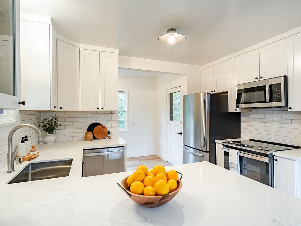 Custom, completed, upgrades include installing a brand new central AC/Heat system, remodeled kitchen with new shaker kitchen cabinets, quartz countertops, stainless steel appliances, brand-new in-unit washer and dryer, fully remodeled bathrooms, and designer lighting and fixtures. Brand new luxury wood vinyl floors run throughout the sun-filled and spacious living areas and bedrooms. The primary and secondary bedrooms feature large walk-in closets. The open kitchen and living areas offer plenty of space for entertaining and casual family living while the tree-house-like enclosed patio provides a tranquil spot to enjoy indoor/outdoor dining or an additional private workspace.