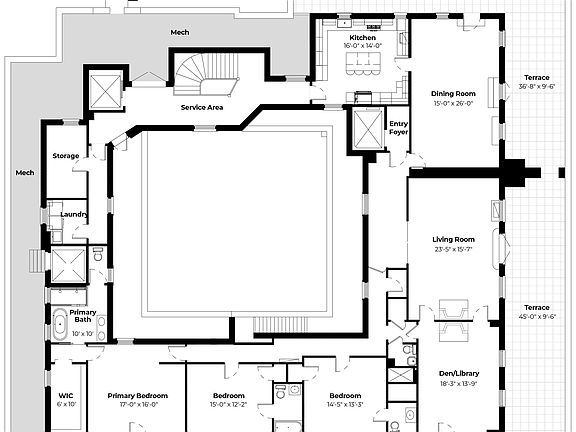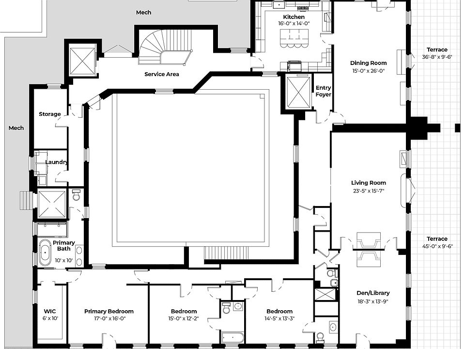A private elevator landing opens to a sizable entry foyer and leads into a home defined by scale, light, and seamless indooroutdoor connection. Formal entertaining rooms include an expansive living room with a wood-burning fireplace, an oversized dining room, and a den/library with a second wood-burning fireplace. The living room, dining room, den, kitchen, and primary suite all open directly to the terraces, creating a continuous flow to the outdoors. The windowed, closed kitchen is ideal for both everyday use and entertaining, with two dishwashers and generous prep space. A separate service area provides dedicated laundry and storage. For added flexibility, the den/library can be enclosed and delivered as a fourth bedroom.