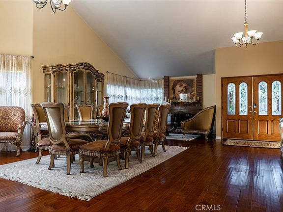 This well-designed two-story home offers comfortable living with plenty of space and updates throughout. The living and dining rooms feature high cathedral ceilings, and the remodeled kitchen with stainless steel appliances opens to a large covered patio, great for entertaining. The backyard includes a pool, spa, brick BBQ, and lighted sports court. The primary suite has vaulted ceilings, French doors to the patio, and a remodeled bath with a spa tub, glass shower, dual sinks, and a walk-in closet. Four bedrooms are downstairs, including two Jack-and-Jill-style rooms and one with a bay window. Upstairs, a private bedroom with a bath, walk-in closet, and built-in bookcase works well as an office or studio. Additional features include new hard wood floors, a detached guest house with 1 bed, 1 bath, and kitchen, and a 3-car garage with a storage loft. This home offers a great combination of space, functionality, and amenities!