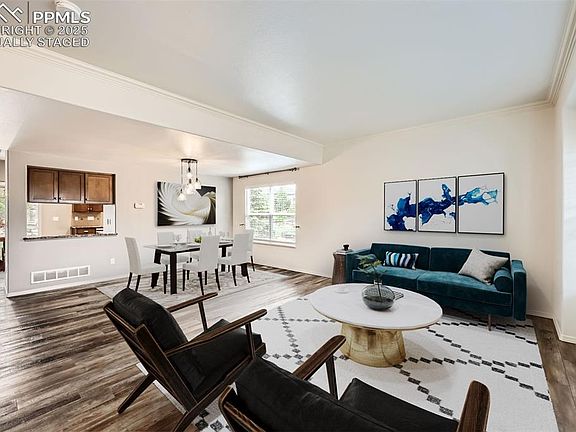 This immaculate two-story home with a full basement is located in desirable Meridian Ranch. Expertly landscaped with fencing, vibrant flowers, and mature shrubs, the curb appeal is unmatched. Step inside to a formal living and dining area adorned with luxury vinyl plank flooring throughout. The kitchen boasts 42-inch cabinets, granite countertops, stainless steel appliances, and a walkout to a stunning backyard complete with a full concrete patio and central air conditioning. A side bar cabinet with granite top for more storage connects the kitchen to the spacious living room featuring a beautiful stacked stone fireplace. Also on the main level are a private office with French doors, a convenient half bath, a laundry area that is hidden from view, and an oversized 3-car garage—with the third bay nearly large enough for two cars or workshop. Upstairs, is that hard to find four bedroom set up and come and enjoy a luxurious primary suite with a five-piece bath and expansive closet space, plus those three additional secondary bedrooms—two with walk-in closets. The finished basement offers a massive rec room for entertainment and sectioned so the one can play pool/ping pong (table stays!!) or enjoy the movies! A wet bar is plumbed on the back wall that shares the bath. An additional, private bedroom rounds out the basement floor plan. Some features of the home are granite counters, newer carpet, luxury vinyl plank flooring, and beautiful decorator touches throughout. Also, come and enjoy the Meridian Ranch membership featuring a full gym, fabulous work out spaces, classes of all sorts, indoor/outdoor pool, and all sorts of teams and league play, along with adult classes and social activities.