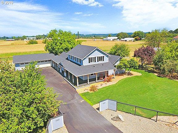 Stunning farmhouse. Country living at it's finest! 4 Bedrooms with master suite on the main floor. Wide open great room, gourmet kitchen walks out to large, sunny deck overlooking the 4.5 acres. Wood floors, wine room, even an interior dog wash! 600sf of covered porch, 30x40 oversized garage w/attached shed, 30X44 barn w/ 4 stalls, tack rm, mechanical rm, and center aisle. Great location, close to downtown Canby and Arrowhead GC