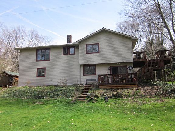 Beauitful split entry home 1 plus acre wooded lot in West Mead. Relax & listen to the stream & enjoy veiws from one of the decks.In winter enjoy cozy evenings in lower FR with gas fireplace.If you need a built in craft room or home office it's all set up for you.Large insulated garage with race car theme.The kitchen,living,& dining rooms give you a relaxing rustic feel with the knotty cedar accents. Large master suite has updated bath & walk in closet. New cedar style vinyl siding,new garage and entrance doors,2 sheds. Both gas & electric heat.Located close to schools & shopping Home warrenty