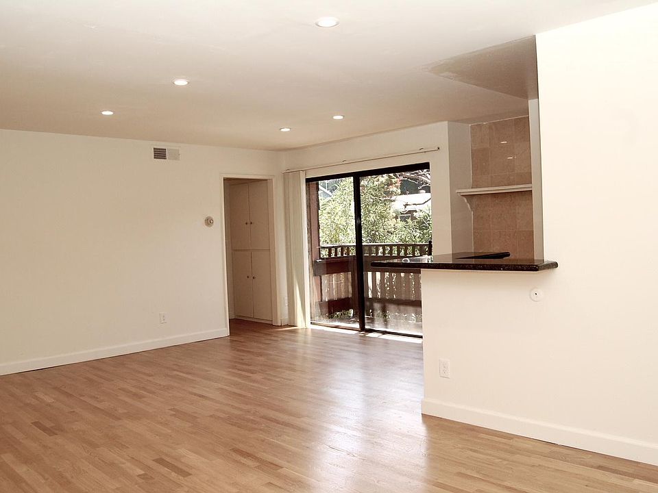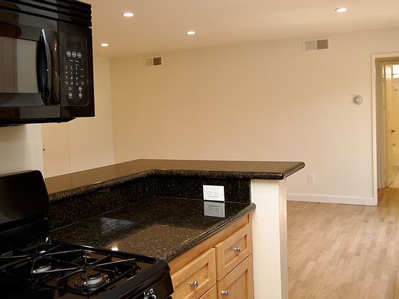First floor unit in a controlled-access entry building. Central heating/air, real hardwood floors throughout, recessed lights in the living room, washer/dryer in the unit. Black granite countertops, gas stovetop oven, microwave, refrigerator, small bar off of the kitchen. Private balcony, linen closet, large bedroom closet and extra-large closet off the living room. Pet friendly and no smoking building. Gated parking, 2 tandem parking spots.