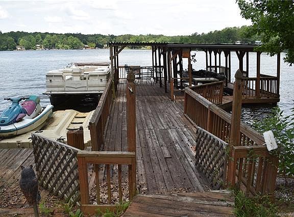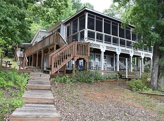 This Badin Lake waterfront home is located on open water with views in multiple directions. Three waterfront lots total (.4 acres), and 149 feet of waterfrontage. Stationary pier with covered boat slip and lift, covered sitting area, 2 PWC ports, and seawall. The main level features an open floor plan with two bedrooms, kitchen, dining area, and living room with fireplace. The spacious master bedroom is lakeside with views. Ceiling fans with remotes. A large lakefront screened porch with ceiling fans spans the entire front of the home. The basement area includes two rooms currently being used as bedrooms, and a full bathroom. Covered, lakefront deck off the basement, and an outdoor shower. Basement shop/storage area. Concrete driveway and carport. Roadside covered deck and grilling area. Huge storage building. Sewer fees paid and connected. Additional lot across street available for purchase (.11 acres). Boat, jet ski, and furniture negotiable.