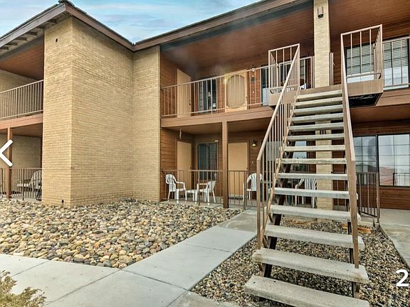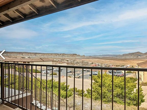Very nice studio/condo at Lake Powell with gorgeous views. Just outside town in a quiet, mountainside community. There's a Discovery Deck for enjoying the view, as well as a picnic area with charcoal grills. Upstairs unit is fully furnished with high-quality Southwest furniture & decor, including a Murphy bed with storage cabinetry, futon couch/bed, chair & ottoman, desk, table with 4 chairs. Dishes, pots/pans, & appliances including stackable washer/dryer, large pantry & a lockable storage closet on the entry porch. Avail aprx 10/15/25.