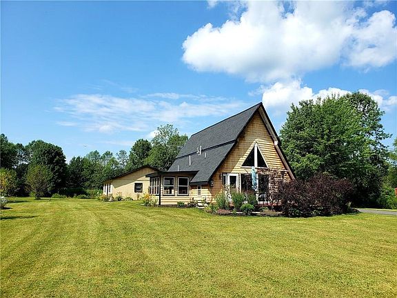 This 3-bed, 2-bath home is located on a quiet country road 20 mins outside of Syracuse. The park-like 4+ acre lot includes a small pond, mature trees, & plenty of space to roam. Featuring a dramatic open floor plan with 20-foot cathedral ceilings in the living/dining area & maple engineered hardwoods throughout. The remodeled kitchen features shaker cabinets with soft-closing drawers & doors, beautiful white quartz counters, whirlpool appliances & a 5-burner gas range. Two large bedrooms downstairs include built-in closet organizers. Up the spiral staircase in the main living area is a small desk and built-in shelving. Enjoy the master-suite with a modern glass-tiled bathroom, several closets, & cathedral ceilings plus a finished loft. Plus a 2 car detached garage with plenty of storage!