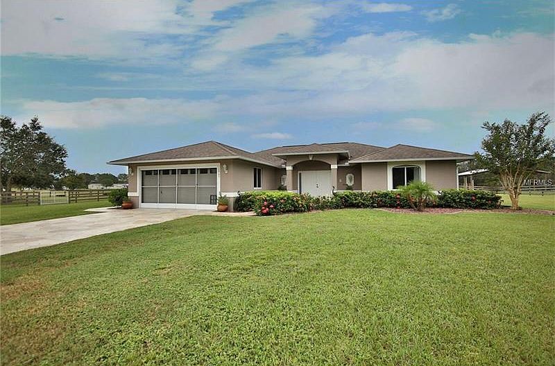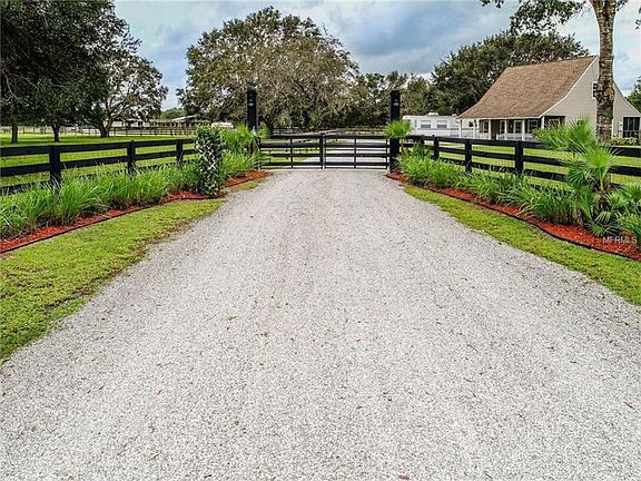 This stunning 7+ acre estate will remind you of Old Florida with its oak trees and native Florida plant life. This horse farm is fully fenced with perimeter top rail and horse fencing with a four-rail presentation. Electronic gate entry to access this estate and the surprises will amaze you. From the large pond with a 55 ft. wood dock and aeration fountain supplying water for irrigation. The main home built in 2004 offers over 1700sf of open living space with vaulted ceilings and clear views of the private yard and heated swim pool under the screened lanai. The home was fully re-modeled in 2012, receiving engineered Acacia Wood floors, granite counters in the kitchen and both baths. French Provincial wood cabinetry and top quality stainless steel appliances. In addition, the new California closet system was installed in the master closet. Plus, the home was completely repainted, received a new hot water heater, air-conditioner system and pool pump in 2016! The guest house, constructed in 2010 provides over 850sf of air-conditioned comfort with 1 bedroom, 1.5 baths with exposed natural cedar beams. The loft in the guest house features a loft with the ½ bath for overflow guests, Corian counter tops. There is also an RV hook-up with a 36ft Heritage Park Style camper with 1 bedroom and 1 bath included and received a new roof in 2017; it also features a large exterior wood deck. Outbuildings include a single-stall barn with a 48x38 pole barn with concrete floor prepared with 6 stalls, tack room and wash room.