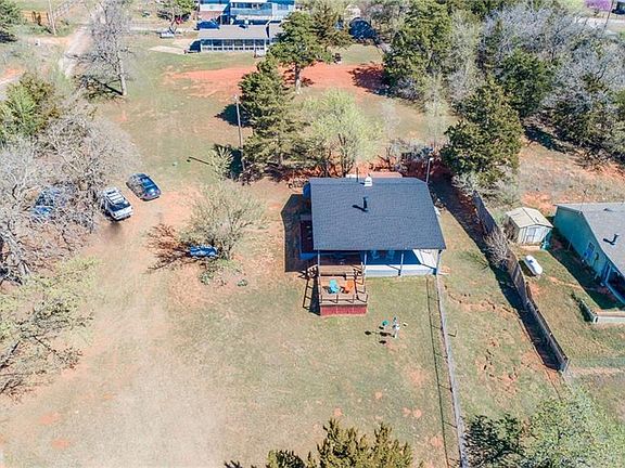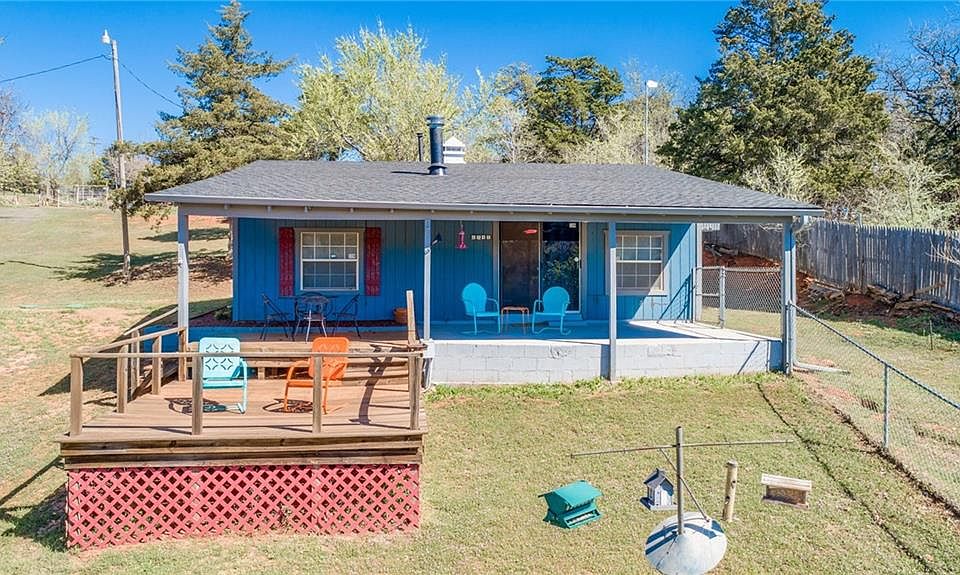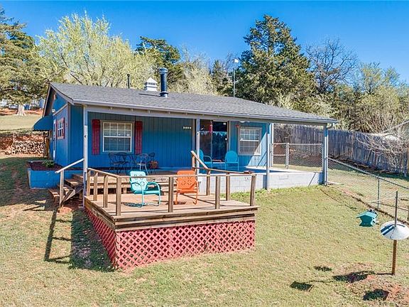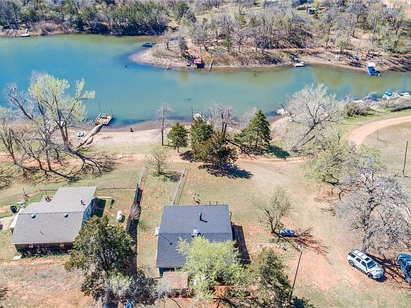 Lakefront cabin at Cedar Lake. Cedar Lake is a gated 80 acre lake area 1hr drive from OKC Metro. Boating, fishing, swimming, 4-wheeling, kayaking. The ultimate lake cabin with boat dock. Perfect for fulltimers or weekend fun lovers. About 25 yards to water. Sweeping covered porch and deck and sun deck overlooking water. Storage building for toys. 2 beds/1 bath. Living room with wood burning stove. Large bright kitchen and dining area. Sits on 1/2 acre manicured lawn. Large fenced dog area. Updates include: roof and gutters 2023, aerobic septic, well pump replaced, electric upgrade, 2 pane vinyl windows. This cabin has never been on the open market. Waterfront is rare and very hard to get at Cedar Lake. Charming, beautiful lake cabin.