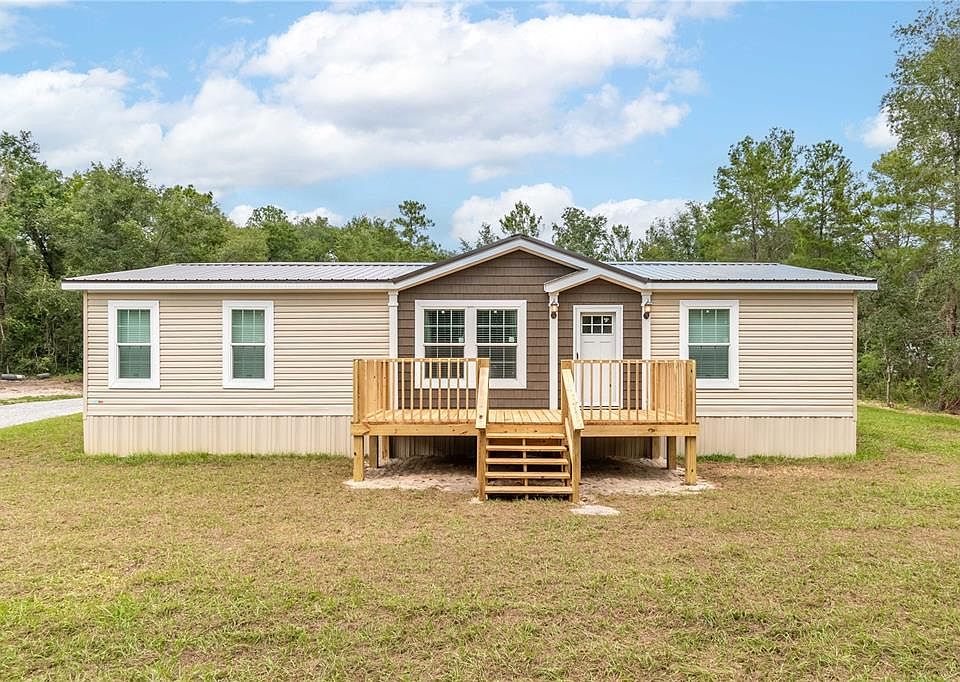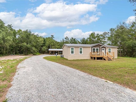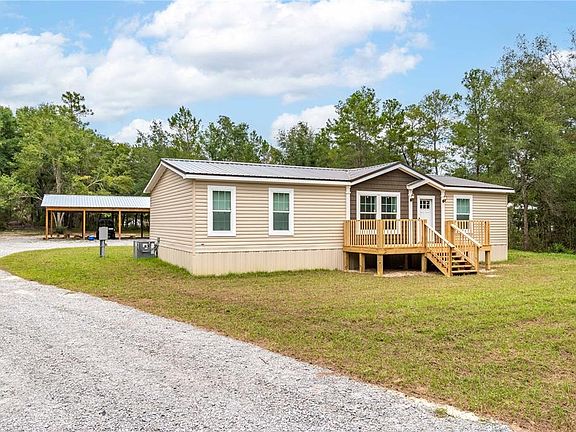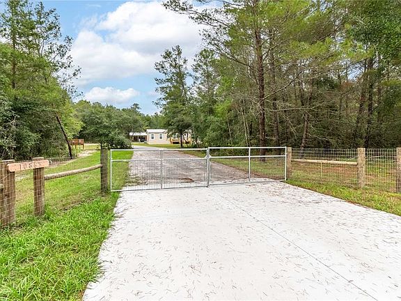 Freshly completed and never occupied, this pristine 2024 manufactured home is ready for its first owner! Fenced and gated on over 3 acres in the peaceful Island Lake Acres community, the property is offered fully furnished with brand-new furnishings throughout, perfect for a seamless move-in or immediate rental opportunity. The 3-bedroom, 2-bath split-bedroom layout offers 1,404 square feet of thoughtfully designed living space. Inside, you’ll find a bright open floor plan that features luxury vinyl flooring, lots of natural light, and modern finishes that combine comfort and style. The kitchen includes an eating nook and comes equipped with stainless steel appliances, a large center island with breakfast bar, and ample cabinet and counter space. A separate laundry area with washer and dryer is also included. Step outside to enjoy expansive outdoor living spaces, including a generous 10 x 32’ rear deck ideal for entertaining, grilling, or simply enjoying the quiet country setting, and an 8 x 18’ front deck perfect for making a first impression. The property's layout is ideal for those seeking room to breathe, create, or expand. A pole barn with water and power service is in place, including multiple electrical outlets, ideal for workshop use, vehicle or equipment storage, or future hobby farming. An additional storage shed also offers water and electrical hookups, making it highly adaptable for a range of uses. Utilities are fully connected, with a private well, septic system, electricity, and high-speed internet access available, and the zoning allows for flexibility with no HOA or deed restrictions to limit your plans. Located within walking distance of Island Lake and Pegram Lake, this property is an ideal option for those looking to spend time on the water. Lake Ocklawaha is also a short drive away, opening up larger options for fishing, boating, and exploration. This home offers a rare mix of modern convenience and rural privacy perfect for full-time living, a seasonal retreat, or even a fully equipped weekend getaway. With ample space, upgraded features, and all the essentials already in place, this is Florida country living at its most comfortable and convenient!