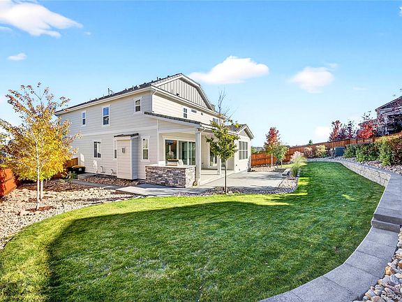 This impeccably maintained 5 bedroom, four bath home with finished basement is sure to impress. Step into the formal entry and the formal dining room (ceiling fan ready) is to your left. To the right is a coat closet, entrance to the basement, the 3 car garage (WiFI capable openers), main floor bedroom and a full bathroom. Continue in to the open concept kitchen with granite countertops, high end stainless steel appliances, & attached sunroom that has a custom glass sliding door with dog door. The kitchen opens to a bright living room featuring a gas fireplace, 5.1 (5 speakers & a sub) wired surround sound, and accordion doors (with wireless remote shades) to the professionally landscaped back yard with wifi enabled sprinkler system. The covered patio boasts a built in gas grill, granite counters & a gas line for your summer bbq. Upstairs you will find the primary suite, laundry, large loft, as well as three other bedrooms. There is a full bathroom in the hall with a double vanity separate from the toilet and tub/shower, and the primary suite has a HUGE walk in shower, two walk in closets as well as a double vanity and tray ceiling. All thermostats throughout the house are smart thermostats. Head downstairs to the finished basement featuring a huge great room, as well as another bedroom with an egress window and attached jack and Jill style 3/4 bathroom. The basement also has a storage room as well as the utility room. Custom window coverings stay with the home. Close to shopping, 470, and I25 for a fast commute.