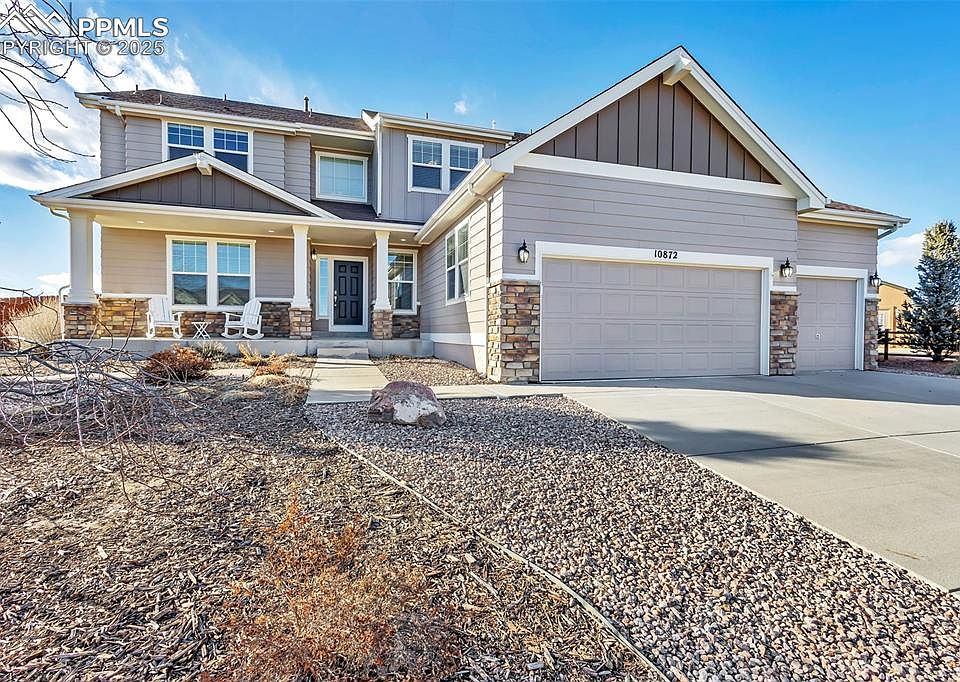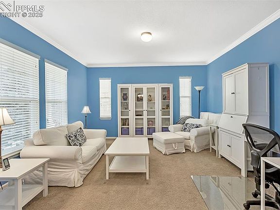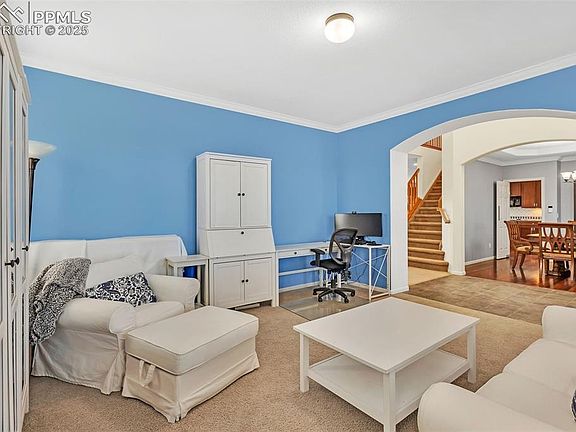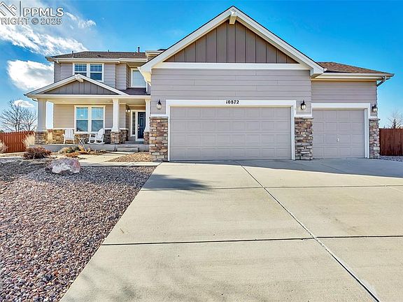 Discover the perfect blend of elegance and comfort in this expansive 6-bedroom, 4-bathroom home in Meridian Ranch, backing directly to Antler Creek Golf Course at Tee 14. With over 5,000 square feet, this stunning property offers breathtaking views of Pikes Peak and thoughtful design details throughout. The gourmet kitchen and dining area shine with Brazilian Cherry hardwood floors and matching cabinets, creating a sophisticated yet inviting space to gather. The open floor plan flows effortlessly into the spacious living areas, ideal for entertaining or relaxing. A main-level bedroom with French doors adds flexibility for guests, an office, or multi-generational living. The luxurious primary suite includes a spa-like 5-piece bath, complete with a soaking tub, dual sinks, and separate his-and-hers closets. The fully finished basement is an entertainer’s dream, boasting a granite wet bar, theater room, and a striking floor-to-ceiling rock fireplace. Built-in ceiling speakers in the main entertainment area by the wet bar enhance the ambiance for gatherings or quiet evenings at home. A spacious basement bedroom provides privacy and comfort for guests or family. Step outside to an expansive patio overlooking the low-maintenance xeriscaped yard, perfectly designed for enjoying serene mornings or lively gatherings with golf course and mountain views as your backdrop. Located in a vibrant community with parks, trails, and convenient amenities nearby, this home is a rare opportunity to enjoy luxury living in one of Meridian Ranch’s most desirable settings. Don’t miss your chance to make this exceptional property your own!
