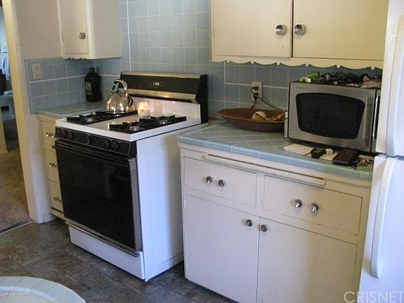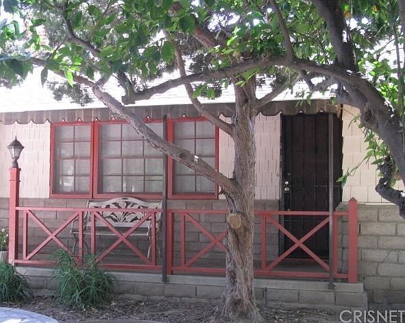 Adorable 2BR. + 1BA situated in Old Granada Hills. White Oak Street lined with historical trees and within walking distance of shopping centers. Newly painted outside. Tan slump stone completely fenced rear yard with citrus trees. Double detached garage plus covered carport attached to the house. Newer stamped concrete driveway from the street to rear patio/garage. Raised foundation with carpet throughout. Remodeled bath with tile floor. Retro kitchen with ceramic counter tiles. Wood burning fireplace in the living-room. Window air conditioners.