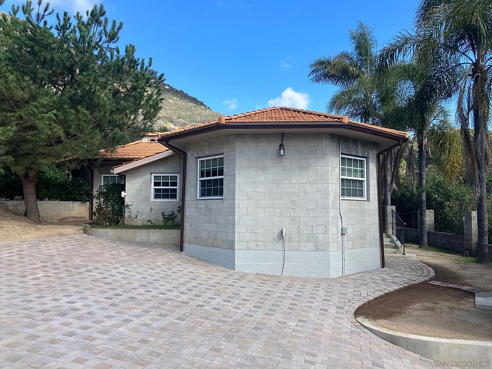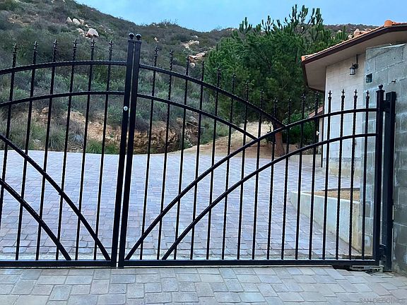 - 10.74 ac with 1,191 sq ft custom house - North end of property has hilltop with ocean visible: 2+ acres of usable land, video available - 1 min. drive to I-15 & Deer Springs Rd exit, across the street from Golden Door spa resort - 9.5 ft ceilings in kitchen, living room, bedroom, dining room - Concrete masonry blocks (CMUs) outside walls, great thermal and sound insulation - High-end double-pane windows and doors - Roof has high-grade clay tiles from France, insulated ceilings - Hydronic floor heating, high-efficiency propane instant heater controlled by thermostat, 5 separate heating zones - Cozy wood fireplace in living room - Master Bathroom has corner Jacuzzi, Carrara marble floor, and ceramic wall tiles - Kitchen has beautiful travertine floor, granite countertops, custom-made real-wood Knotty Alder cabinets, Bosch oven / dishwasher / induction cooktop - Existing house can become an ADU (Accessory Dwelling Unit) if buyer wants to build larger 2nd house, large flat building pad available - Property eligible to have a non-habitable structure (e.g. barn, storage building, or hobby shop) up to 6,400 sq ft big - Plenty land to create other building pads - Property gated with 16 ft dual swing iron gate, with outdoor pulsed infrared sensors connected to alarm system - Alarm controlled remotely by smartphone, provides info about activity of sensors surrounding building - Fruit trees provide delicious lemons, oranges, mandarins, and figs
