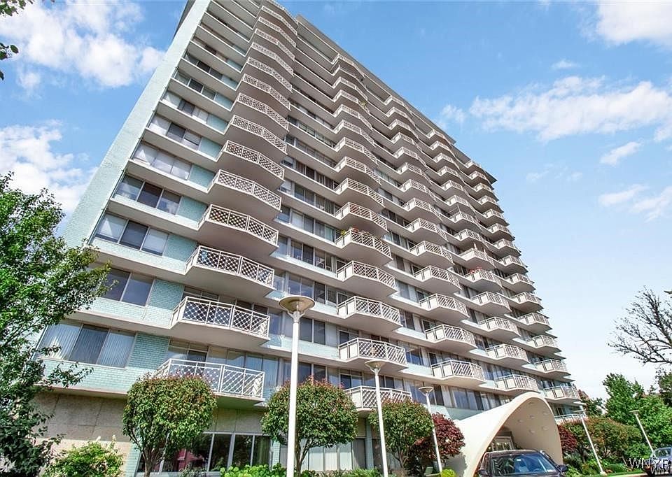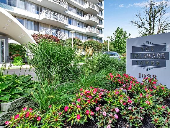 Wonderful one bedroom unit at the incomparable Delaware Towers; this truly central city location cannot be beat! Bright and tidy unit includes a spacious combination living/dining room with fantastic natural light, beautiful built-ins, and a sliding glass door to private balcony...perfect for entertaining. Kitchen offers electric oven/range, dishwasher, refrigerator, and microwave, and features a lovely tile backsplash. Gracious bedroom boasts ample closet space and a wall of windows. Full bathroom with tub/shower, parking (one outdoor space), common laundry, storage unit, and more! Convenient proximity to Elmwood Village, medical campus, theatre district and more.
