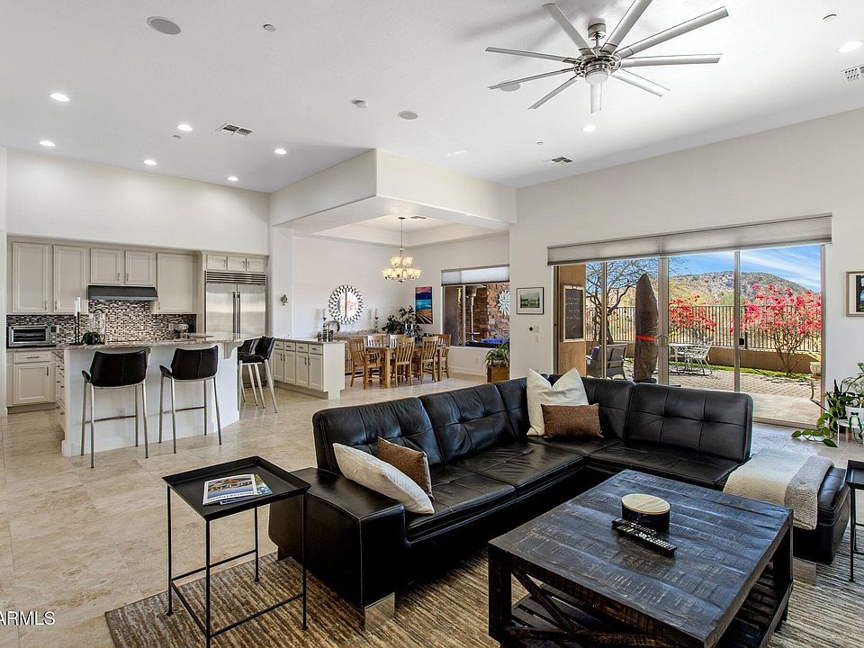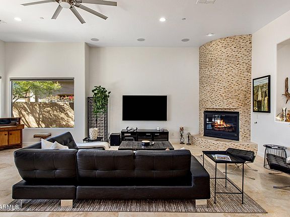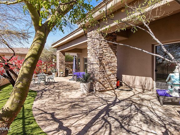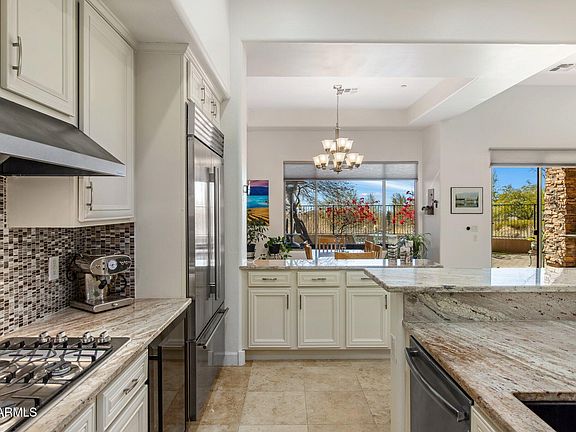 Enjoy breathtaking mountain and city light views from your backyard, perfect for entertaining. The patio is plumbed and ready for a gas grill, making it easy to host gatherings with friends and neighbors. Inside, soaring ceilings enhance the spacious Great Room, which features a custom stone fireplace, travertine floors, and a 3-zone surround sound speaker system. The kitchen boasts granite slab countertops, a stylish tile backsplash, a gas cooktop, a wine cooler, and a convenient breakfast bar. Surrounded by stone-accented architecture and manicured desert landscaping, this home offers both elegance and tranquility. Residents of this private gated community enjoy access to a pool and spa, set within a serene desert and boulder backdrop. Explore the scenic trails that wind through the surrounding neighborhoods, offering stunning views of the Sonoran Desert, Troon Mountain, Pinnacle Peak, and the McDowell Mountains.
