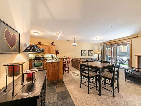 Adjacent to the living area, a stylish four-person dining table invites guests to gather for meals, card games, or apres-adventure stories. The fully equipped kitchen is designed for both convenience and connection, with a bar-height counter and stools that make breakfast, coffee, or evening drinks a social affair. Whether you're preparing a hearty dinner or enjoying takeout from a local favorite, this space has everything you need, including modern appliances and ample storage.