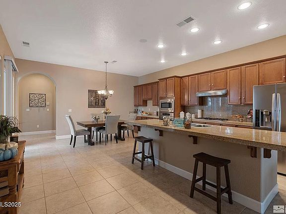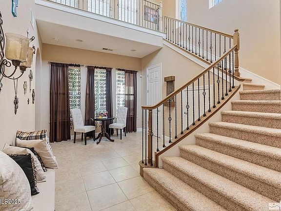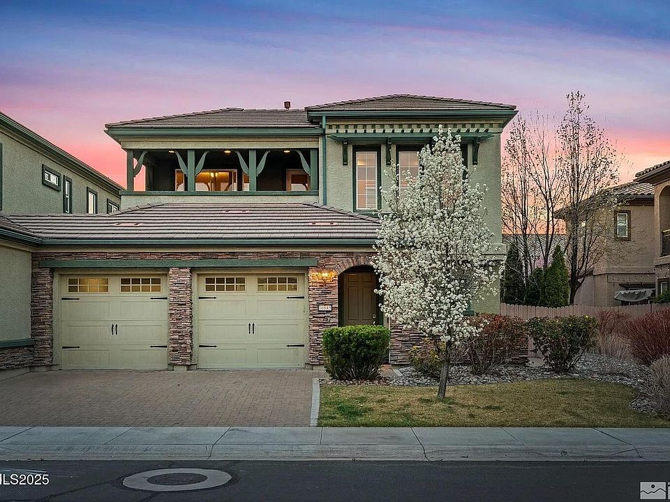 Luxurious home in a private gated community in Damonte Ranch. This elegant 3-bedroom, 2 full and 2 half bath residence offers approximately 2,988 sq ft of thoughtfully designed living space. The open floor plan begins with a dramatic stairway and spacious foyer, setting the tone for gracious living. The great room features a cozy gas-log fireplace beneath a coffered ceiling, while the chef's kitchen is equipped with a large island, breakfast bar, and abundant cabinetry. Sliding glass doors lead to a charming courtyard—perfect for summer evenings—or to a larger private patio with decorative paver walkways. The main-level primary suite is a peaceful retreat with dual vanities, a soaking tub, walk-in shower, and expansive walk-in closet. Upstairs, a spacious loft and two balconies offer flexible areas for work, hobbies, or relaxing with views. Located in a quiet gated neighborhood, this property provides security and easy access to parks, trails, schools, shopping, and dining—offering the perfect blend of comfort and convenience.