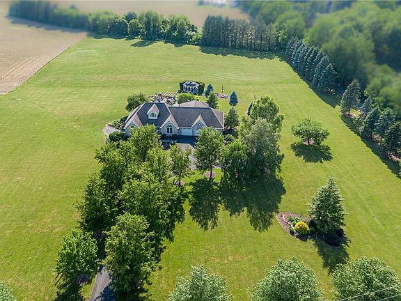 Stately brick ranch appropriately set back from the quiet country road. 12.62 acres of prime, level & mostly open acreage. A ceramic tiled foyer w/ columns flows into the spacious living room w/ floor to ceiling brick fireplace flanked by arched windows. Vaulted ceilings in foyer, living & dining rooms, skylights. Corian counter tops & double sink in the kitchen. Hardwood floors in bedroom/office, hall & formal dining room. Master bedroom w/ walk-in closet & ensuite w/ private entrance to patio via French doors. The two bedrooms are on opposite side of home lending privacy to the master suite. Laundry room w/ half bath & sink. Ample closet space throughout. Large basement, 3 car garage. Entertainment wonderland in rear of home equipped w/ multi-level patio venues, fireplace, large gazebo & trellis. Neat barn where stalls can be added. New owner needs to hook up electric to nearby pole. Small accessory barn was just resided & has a new roof. Ideal land for horses & or other livestock.