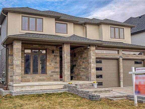 Welcome to this gorgeous and stunning North London two storey home. The beautiful exterior features a 2 car garage, interlocking brick driveway, covered front porch and large deck with covered area. The interior features includes wooden flooring, large windows, upgraded light fixtures with loads of pot lights, rough in central vacuum etc. A modern oversized kitchen with granite countertops, custom cabinets, pantry. The great room includes a gas fire place, featured tile wall and rough in for 9.1 sound system and a convenient main floor laundry. The upgraded Oak stairs leads to the captivating upper floor, extending the hardwood floors throughout the hallways and the bedrooms. The classy master suite features a walk in closet, spa like 5 pcs ensuite, including glass shower, free standing tub, double sink vanity with quartz countertops. The second master suite has a 3 pcs ensuite and walk in closet. Rounding out the bedroom level are 2 more good sized bedrooms and a generously sized main bathroom. The basement awaits your designer touch with large windows, added ceiling heights and separate entrance. This property wont last, book your showing now!!