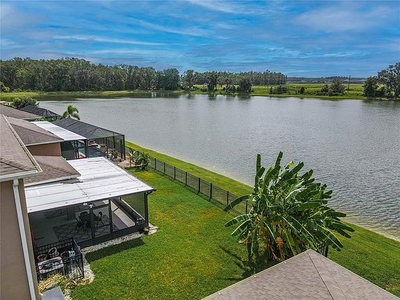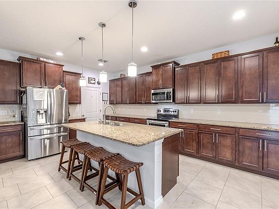 Welcome to this beautifully maintained 5-bedroom, 3-bath home positioned along a tranquil pond in the desirable community of Union Park. Built in 2019, this two-story home blends thoughtful design with modern comfort, offering a peaceful backdrop of water views from multiple rooms. The exterior makes an immediate impression with stacked-stone detailing, manicured landscaping, and a wide driveway leading to a three-car garage. The covered front porch with an outdoor outlet is a comfortable spot to enjoy morning coffee or evening light while overlooking the lush yard. Inside, a bright foyer leads into the formal dining room, where natural light pours through large windows. Tile flooring flows through the main living spaces, balancing style with durability, while soft carpeting in select rooms adds warmth and comfort. Two hallway closets provide extra storage before the home opens to the main living area. The kitchen is as functional as it is beautiful, featuring granite countertops, an oversized island with seating, upgraded Frigidaire stainless steel appliances, an LG refrigerator, and a reverse osmosis water system. The walk-in pantry keeps everything organized, while the breakfast nook overlooks the family room and serene pond beyond the backyard. From here, sunlight reflects off the water, filling the space with a sense of calm and connection to the outdoors. Sliding glass doors open to a screened-in lanai that captures the best of Florida living. The water view creates a peaceful backdrop for quiet mornings or weekend gatherings, while the extended concrete patio offers space for grilling or lounging in the sun. The fully fenced backyard features St. Augustine grass and a full irrigation system, offering a private retreat that is both beautiful and easy to maintain. The first floor also includes a welcoming guest bedroom beside a full bathroom with a granite-topped vanity and walk-in shower. Entering through the garage, a small hallway nook leads to a storage closet and connects directly to the guest area, providing a comfortable setup for guests or multigenerational living. Upstairs, a spacious bonus space separates the primary suite from the additional bedrooms, allowing both privacy and functionality. The primary suite overlooks the water, creating a calming view to start and end each day. It features dual walk-in closets and a spa-like ensuite bathroom with granite countertops, dual sinks, a soaking tub, a separate glass-enclosed shower, and a private water closet. Two secondary bedrooms include walk-in closets, while the third features a standard closet. A hallway closet offers storage for linens or seasonal décor. The upstairs laundry room includes a matching Frigidaire washer and dryer and a utility sink for easy cleanup. Union Park is a master-planned community offering two resort-style pools, a fitness center, clubhouse, tennis and pickleball courts, playgrounds, a dog park, and scenic walking trails. The community’s layout encourages outdoor living with winding sidewalks, shaded paths, and peaceful pond views. This home is conveniently located near The Shops at Wiregrass, The Grove, Epperson Lagoon, and multiple golf courses. With nearby dining, entertainment, and easy access to I-75, you are never far from the best of Wesley Chapel living. Schedule a private showing today and discover all that this beautiful Union Park home offers.