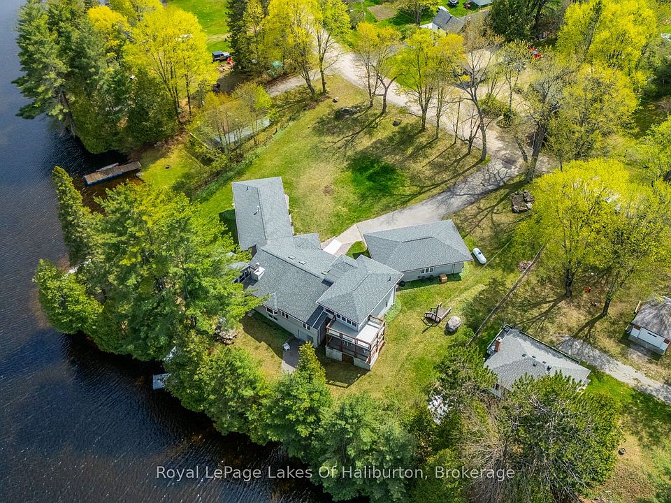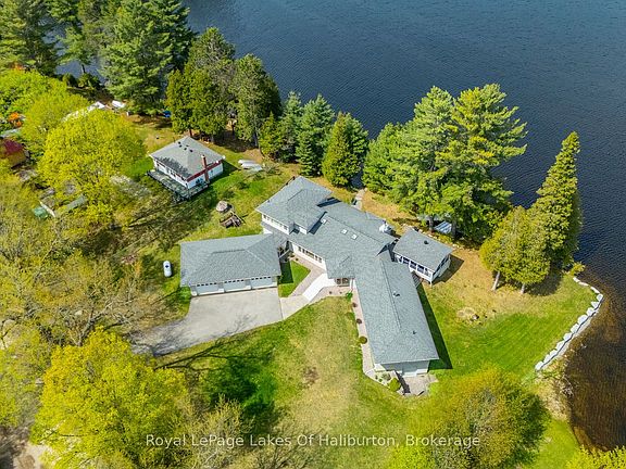 Architecturally designed, executive home on Gooderham Lake. Exceptionally maintained and showing pride of ownership, this gorgeous lakefront home offers over 4000sq.ft. of living space on a nicely landscaped, level lot. Starting at the waterfront, you'll love the beautiful sunrise views over the lake and the clean, sandy shoreline which is great for swimming. The lake also offers wonderful fishing and water sport opportunities. Just a few steps up from the water is where you'll find this spectacular home that offers something for everyone. All the interior rooms are open and spacious and many include tremendous views of the lake. From the airy living room with vaulted ceilings and a cozy fireplace, to the chef's kitchen with custom cherry cabinets and open access to the family sized dining room, you'll appreciate the attention to detail. The primary bedroom comes with his and hers walk-in closets and a masterful ensuite. Two other generously sized bedrooms are also on the main floor. One set of accessible stairs takes you up to a large space that is perfect as a family room or office with a walk-out to a lovely deck area. The other set takes you to the lower level where you'll find a media room, guest room and two workshops, one of which is sized at 43'x20' with heated floors, a 9' ceiling and a 16' window wall overlooking the lake! Whether you're a weekend hobbyist, a professional contractor or someone looking to start a home based business, this space is perfect. And don't overlook the massive screened-in Haliburton room which expands your outdoor enjoyment. There are so many features to this one of a kind home including geothermal heating/cooling, auxiliary propane boiler heating system, drilled well with top-tier filtration/UV system, a 5-camera security system, and a 3-car insulated garage with enclosed walkway to the house, all located within walking distance to Gooderham. Priced substantially lower than replacement value. Must be seen to be appreciated!