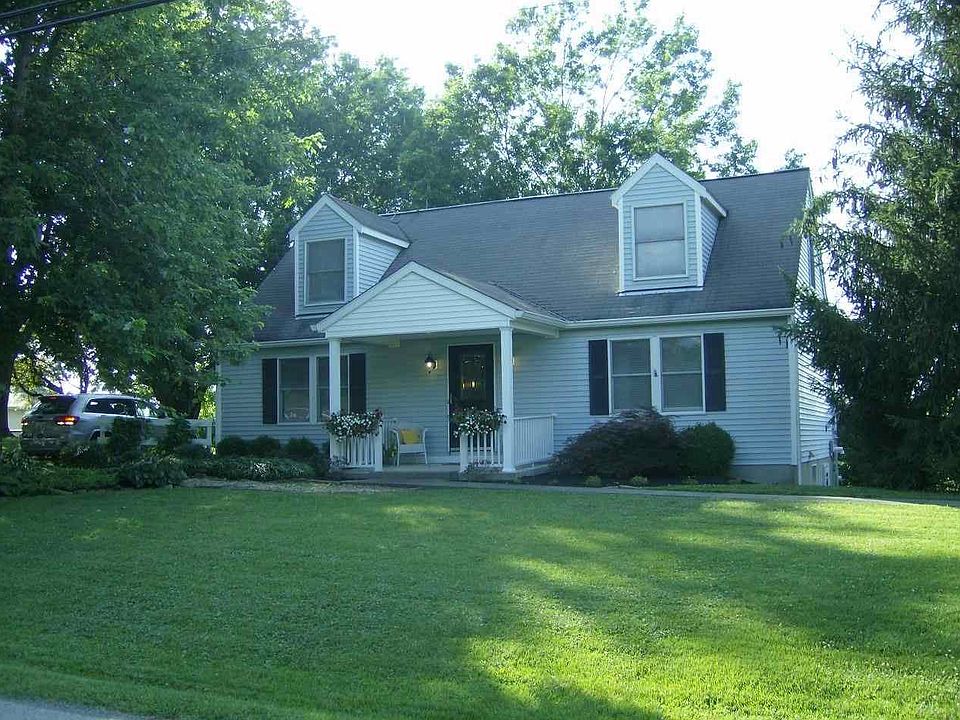 New Price!! Updated delightful cape-cod surrounded by mature shade trees and features an impressive kitchen w/appliances & wine fridge, counter bar, tile, dining area w/ walk-out to deck, wood laminate flrs in main living area. Built-ins in liv rm & crown molding. Lower level fam/recreation rm has a bar with stools. The home has a partly finished walk-out bsmt. Two first flr bedrms & huge master on 2nd level with all tile master ensuite & jetted spa tub, shower w/ unique custom glass enclosure, two vanities & a huge walk-in closet. Mature landscape, rear deck, storage bldg, 2 driveways.