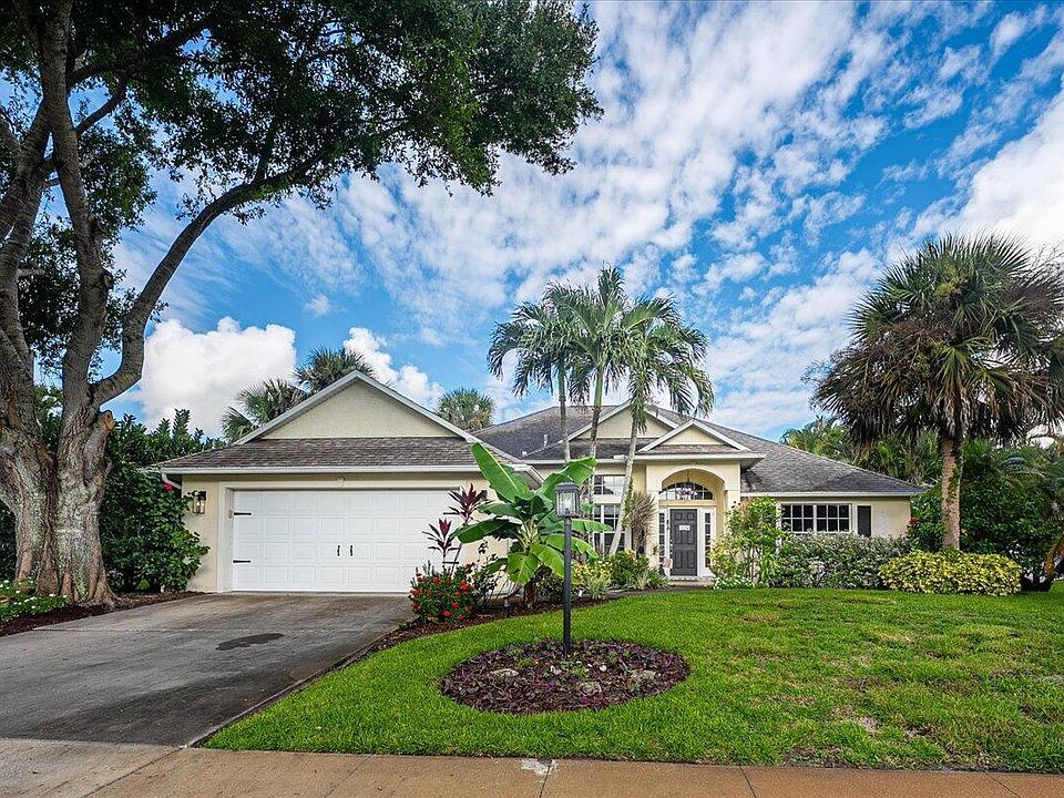 This is a must see cozy 3BR/2BA in a desirable community! Enjoy seamless indoor-outdoor living with pocketing glass sliders that open the home to a solar-heated pool and expansive screened lanai featuring a stainless steel and granite summer kitchen perfect for entertaining. You'll find volume cathedral ceilings throughout and a split-bedroom floor plan for added privacy. The kitchen is a chef's dream with two sinks, 42'' cabinetry, and stainless steel appliances. Bathrooms have been tastefully updated, and neutral tile flooring extends through all main living areas. The privacy-fenced backyard is beautifully landscaped, and the home comes equipped with storm shutters for peace of mind. Additional highlights include low HOA and a neighborhood with sidewalks and streetlights.
