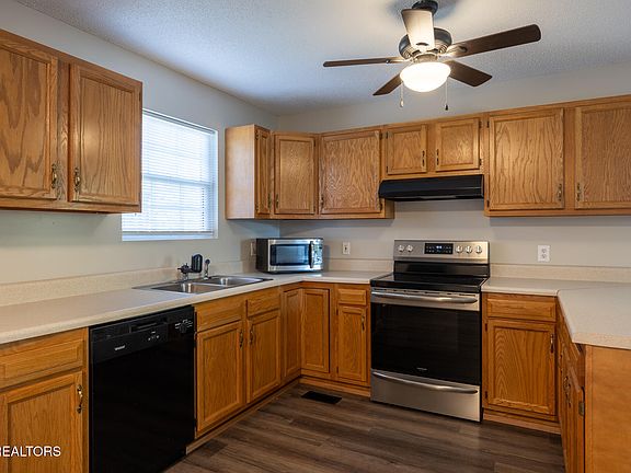Kitchen appliances include a refrigerator, stove, dishwasher, and microwave. Laundry appliances include a washer and dryer.