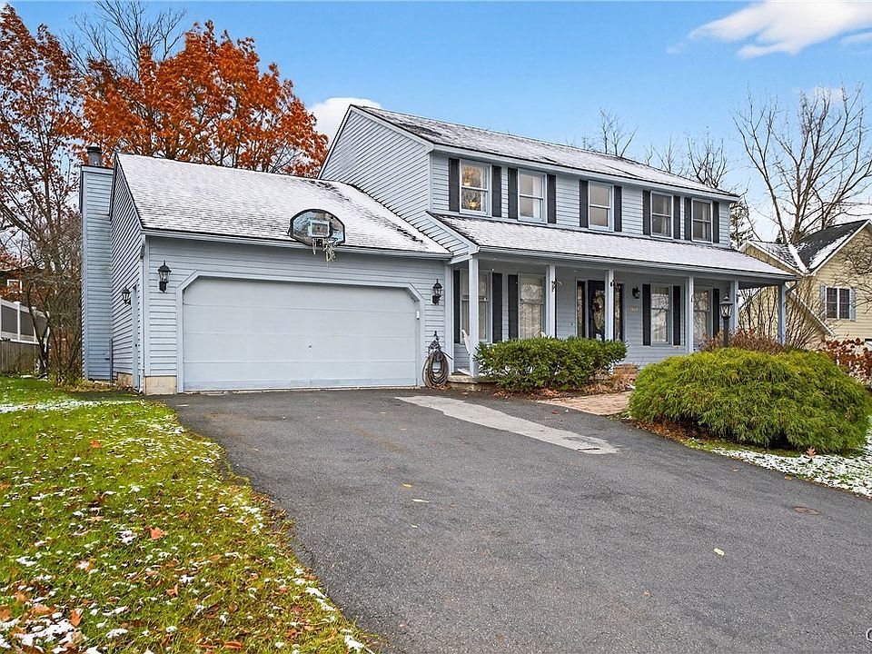 Welcome home to this spacious and beautifully cared-for 4-bedroom, 2.5-bath colonial offering 2,340 sq ft of living space on a quiet cul-de-sac. As you enter, you are greeted by a warm and inviting layout designed for comfort and functionality. The kitchen serves as the heart of the home with granite countertops, a center island, and plenty of cabinetry and workspace—ideal for everyday cooking and entertaining. Just off the kitchen is a large living area featuring vaulted ceilings, skylights that fill the space with natural light, and a striking wood-burning fireplace with a full stone face, creating a cozy atmosphere year-round.