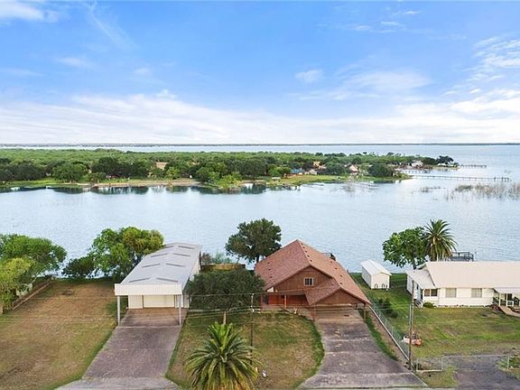 WOW!!! THIS DOESN'T HAPPEN VERY OFTEN-A NICE HOME ON THE WATER AT LAKE CORPUS CHRISTI WITH 3 LOTS AND A METAL BARN APPROXIMATELY 30X50 WITH WATER ON BOTH SIDES!!! THE LOG HOME HAS OPEN LIVING, DINING & KITCHEN AREAS, ALL WITH FANTASIC VIEWS OF THE WATER WITH AN ADJOINGING PATIO THAT LEADS TO THE CONCRETE BULHEAD & PIER. 2 BR'S AND A BATH ARE DOWNSTAIRS AND ANOTHER FULL BA IS IN THE DOUBLE CAR GARAGE, ALONG WITH A SEPARATE UTILITY ROOM. UPSTAIRS IS AN INVITING, OPEN LIVING AREA WITH A WET BAR AND AN AWESOME VIEW OF THE WATER. IT SPORTS A LARGE DECK WITH AN EVEN BETTER VIEW OF THE LAKE. THERE ARE 2 BR'S, A BA AND SPACIOUS CLOSETS UPSTAIRS. THE KITCHEN OFFERS A COOK-TOP WITH A GRILL AND LOTS OF CABINETS. THE ROOF WAS REPLACED IN 2013 AND HAS A LIMITED 30 YEAR WARRANTY. THE PRESSURE TANK FOR THE WATER WELL WAS REPLACED IN JAN. 2017 AND HAS NEW PLUMBING AND SWITCH. THE BARN HAS A 1/2 BATH, 2 LARGE DOORS,1 REG. DOOR, A CLOSET, A COVERED CARPORT AND A COVERED PATIO FACING THE LAKE.
