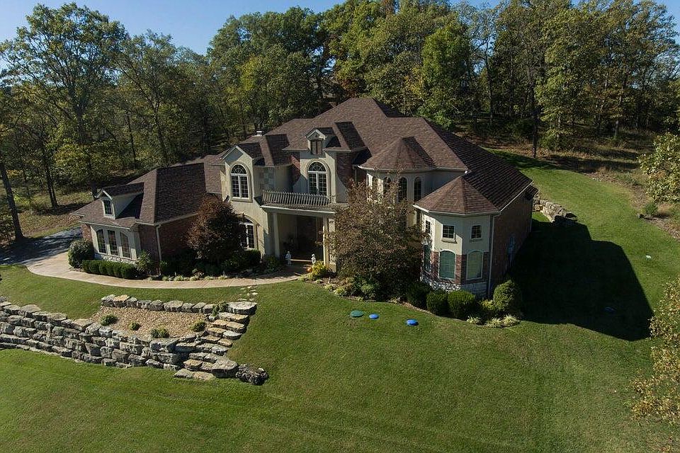 Set against a backdrop of breathtaking Ozark mountain views, this meticulously maintained and stately 2-story home--built by renowned Landmark Homes--offers timeless craftsmanship, exceptional care, and a peaceful setting that's hard to match. With soaring ceilings and walls of windows, natural light fills the living spaces, highlighting elegant architectural details throughout--from custom woodwork and dramatic entryways to two stunning floor-to-ceiling stone fireplaces.Just off the kitchen, you'll find a cozy hearth room--perfect for morning coffee or evening relaxation--while the formal living room stuns with grandeur and natural light. The kitchen itself features granite countertops, a walk-in pantry, and a smart layout perfect for everyday living or entertaining.The absolutely massive main-level primary suite offers two walk-in closets, access to the covered patio, and an en suite bath with serene views from a jetted tub surrounded by oversized windows. A dedicated office sits just off the suite, ideal for remote work or a quiet retreat. Upstairs, three additional bedrooms and a jack-and-jill bath have seen little use, offering like-new condition and flexible space.Storage abounds with extra closets, a 5-car garage, and a large walkable crawlspace--ideal as a storm shelter or workshop. A dedicated storage room could easily convert into a bonus room, hobby space, or additional office. The landscaping is a true labor of love, blending native rock formations with strategic irrigation that reuses diverted rainwater to nourish the sodded lawn.Saddlebrooke is a master-planned community between Springfield and Branson, offering a clubhouse, pool, tennis courts, playground, and miles of scenic trails along a riverbed where deer and turkey roam. Nearby: Busiek State Forest, the National Tiger Sanctuary, and Bear Creek Wine Company.Classic, solid, and well-loved--this home awaits someone who values craftsmanship, nature, and the quiet luxury of Saddlebrooke living.