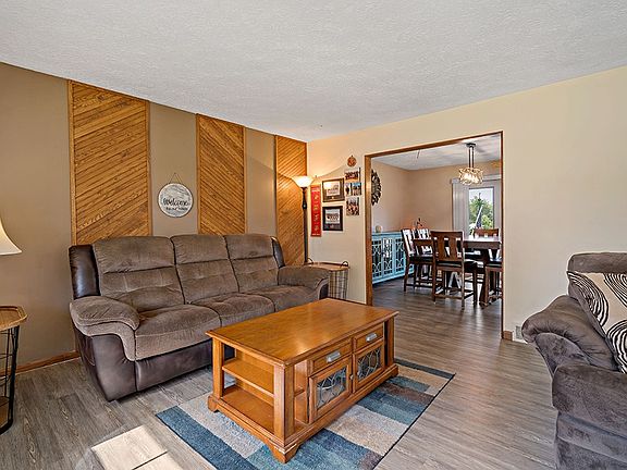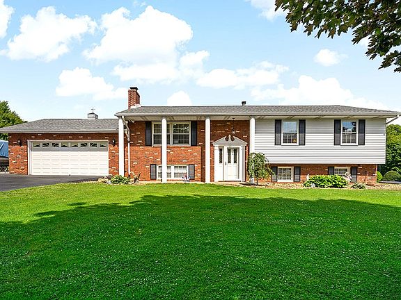 Pristine home sitting on 1.83 acres of flat, cleared oasis. Large drive leads to beautiful brick home. Split entry welcomes you and leads to main level where you will find bright living room with wood wall feature and open concept dining and kitchen. Dining room provides access to back deck. Kitchen offers large island with additional seating, stainless steel appliances, mosaic tile backsplash, pantry and plenty of cabinetry. Bed and baths on this floor as well for easy convenience. Master with updated ensuite, two additional well sized bedrooms and a full bath complete this floor. Huge basement offers so much room to create dream gameroom area. Finished space in basement provides brick fireplace and area to host. Laundry space in basement also. Amazing flat open backyard with two level deck, 7 person hot tub, fire pit and tons of room to expand and entertain. Attached garage and extended driveway parking pad area. Cistern tank on side of home. Close to airport, town and shopping!