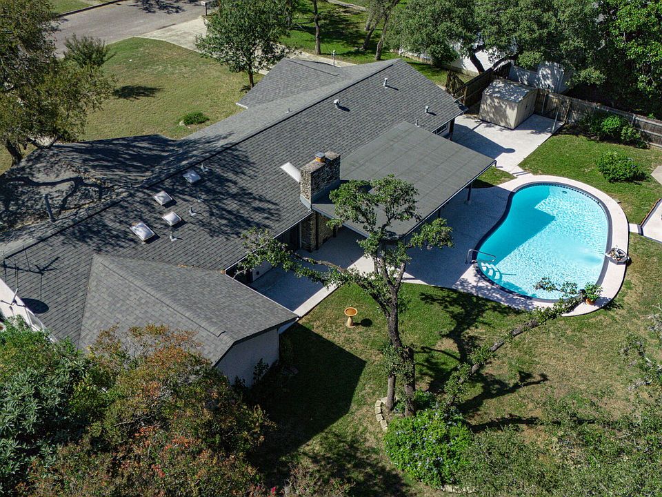Charming south-facing 3 bedroom plus study, 2 bath rambler beautifully situated on a beautiful .41 acre lot with sparkling inground saltwater pool and doublewide drive with triple parking and a pass through gate for golf cart/trailer/jet ski located in the coveted community of Hollywood Park, TX just inside San Antonio's Loop 1604 along Highway 281. This charming single story boasts two living areas - a bright and spacious 25' living and dining room perfect for Thanksgiving dinners and get togethers with friends and a warm family room overlooking the pool with french doors and rustic stone fireplace. A primary suite with outside access to the pool from both the bedroom and the primary bath, separate vanities and makeup area and an adjoining study/home office with shelving and multiple closets.The office could also transition to a beautiful nursery or exercise room or could be converted back to a 4th bedroom. Large windows and skylights offer natural lighting throughout the home. The secondary bedrooms are a roomy 12' X 12'. Just off the utility room is an 11' X 7' bonus area with desk for bill pay that would make a great mud room conversion. The kitchen offers light colored cabinetry, Bosch dishwasher, an insinkerator instant hot water unit and a unique breakfast area with wrap around windows providing a wonderful view of the private landscaped yard and inviting pool. Offering a perfect way to beat the Texas heat, the pool ranges in depth from approximately 3 feet to 6.5 feet. The back covered patio is ideal for outdoor entertaining with extended flatwork for BBQs and game nights. Three sheds provide plenty of storage options and a potting shed for the at-home gardener. The home was rewired with copper wiring, radiant barrier was added to the attic for energy efficiency and all windows in the home and garage were replaced with custom storm windows. One 1.5 ton condenser, matching evaporator coil and furnace was installed in Aug 2024, a 30 year multi-dimensional shingle roof installed in 2020 and 40 gallon hot water heater in December 2017. The primary bedroom and the two baths offer sound proofing walls. Other features include a workbench and built in storage in the large 2 car garage, water softener, rain gutters with Leafguard, quarterly pest control for years, & an American Home Shield home warranty. Hollywood Park offers highly sought after schools, spacious lots, a much loved white tail deer population, volunteer fire department, its own city police and an ideal location 15 minutes from the SA International Airport, 6 minutes to hospitals and medical offices, shopping and dining. Hollywood Park is a friendly community with much anticipated community events including Santa visits, July 4th parade and picnic, Easter egg hunts, chilli cookoffs, arts and craft fairs, etc. A resort style park with state of the art event venue, multiple pools, splash pad, tennis, basketball, volleyball, a pavilion, and access to the Sonterra Golf Course is arguably the best neighborhood amenity offering in north SA. Residents enjoy riding golf carts through the community to visit neighbors or spot newborn fawns. 109 Cueva Ln is a perfect place to create lasting memories. Come Home!