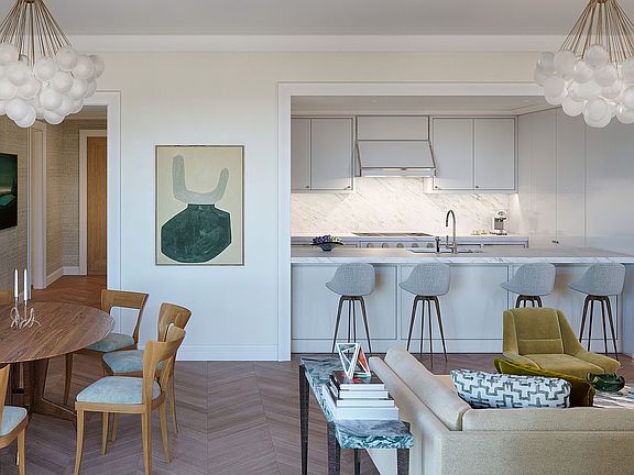 Graciously proportioned and strikingly designed by Steven Harris Architects, Residence 3 North features a 1,863 Sq. Ft. (173 Sq. M.) light-filled interior with the architect’s signature attention to detail infused throughout. Offering two bedrooms, two ensuite bathrooms, and a powder room, this home features northern exposures overlooking landmarked townhouses and verdant landscaped gardens. Elegant architectural details and materials throughout include expansive casement-style windows in a white bronze finish, 4” wide rift and quarter sawn American white oak flooring set in a chevron pattern in all living areas, recessed panel stile and rail doors with burnished nickel Nanz hardware, and custom plaster cornices in all primary rooms, hallways, vestibules, primary bathrooms, and powder rooms.