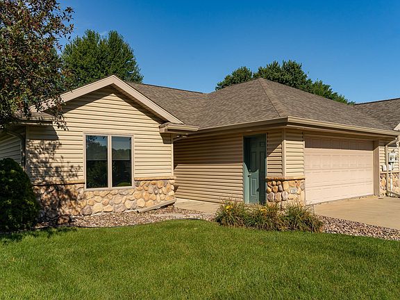 A nice, 2 bedroom 2 bath townhome with 1518 sq ft. and an open concept with vaulted ceilings, in floor heat, great kitchen, nice dining area, great room with a gas fireplace, sunroom with a large patio off of this, primary bedroom with it's own 3/4 bath and walk-in closet. A wonderful 55+ community with walking paths and private streets, snow, lawn and exterior are covered. Approx. age of Ref. 3/4/ yrs, microwave 4 yrs, softener 3/4 yrs, roof 2022. Back on the market as buyer had to cancel due to health issues.
