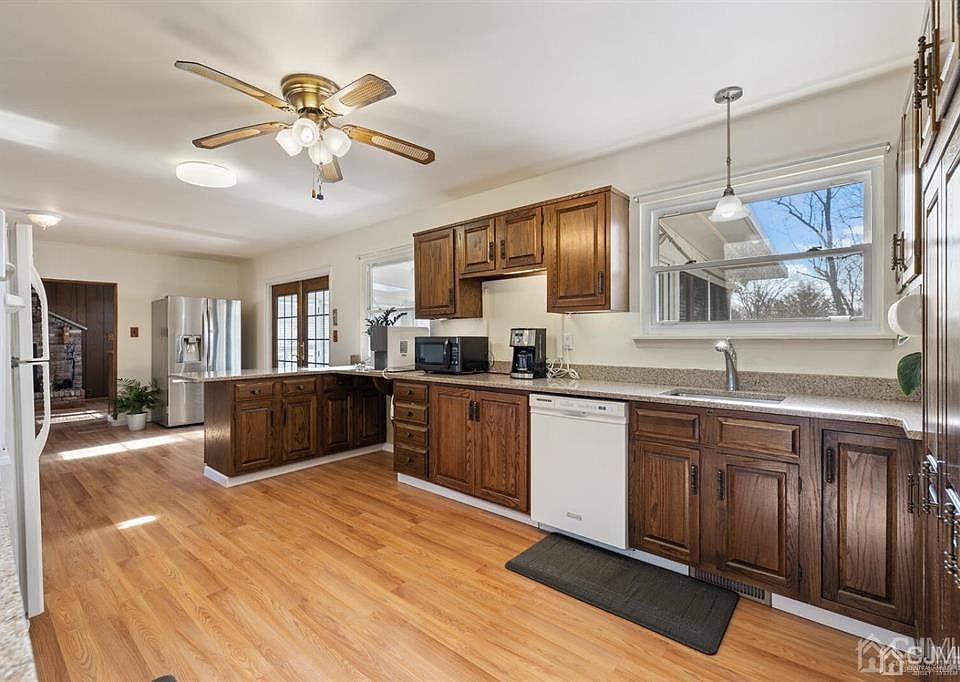 Bright and sunny ranch house with sunroom w/ skylights, 3 bedrooms, 2 bathrooms, fenced front and back yard with shed, manicured yard with trees/plants, seasonal perennial flowers, section fenced garden for growing organic vegetables, spacious huge kitchen - lots space of oak cabinets with granite counter top, breakfast bar, dinette room and formal dining area, open plan living room with large windows, office or den with ceiling fan and wood burning fireplace, double doors from kitchen to sunroom for exercise and comfort, washer dryer, oversized garage, storm door, central AC, forced hot air, public water and public sewer, minutes from Rutgers, Robert Wood Johnson University hospital, lots of parks, bus and train station to NYC, shopping's, major hwys, 287, US 1, 27, TNPK and GSpwy.