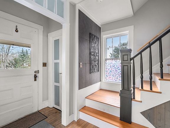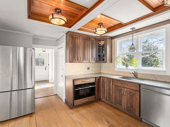 Beautiful craftsmanship throughout this antique home! The completely renovated kitchen features upgraded cabinetry with quartz countertops, tile backsplash, Wolf electric range, induction cooktop, range hood and separate steam oven, coffered ceiling with pendant lighting & breakfast bar. Front to back living room/dining room showcases a gas FP and French doors leading to the covered back porch. Updated half bath with pickled white pine wainscot, complete the first floor. There are 3 bedrooms on the 2nd floor, one with an en suite bath & a door leading to the upper deck, and a full hall bath with clawfoot tub. Hardwood flooring & custom wood trim through-out. Additional upgrades include a newer 30 yr arch. roof, upgraded electrical, insulation, high eff natural gas boiler, split system heat pump for heating/cooling on the 1st floor, and new heat pump water heater. Enjoy the perennial gardens from the front porch or relax on the 2nd story deck overlooking the private backyard.