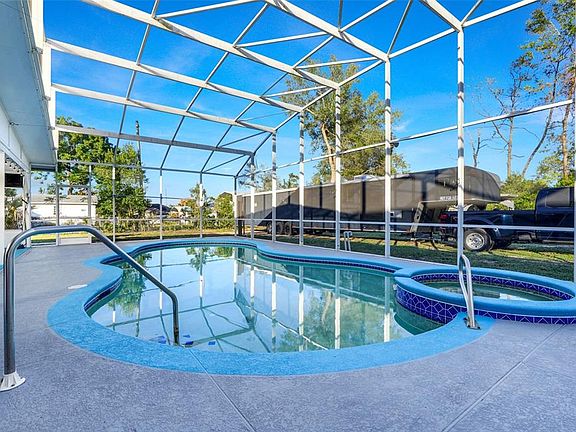 Two primary suitesSpacious screened-in pool enclosureExpansive outdoor areaRenovated kitchen and bathrooms